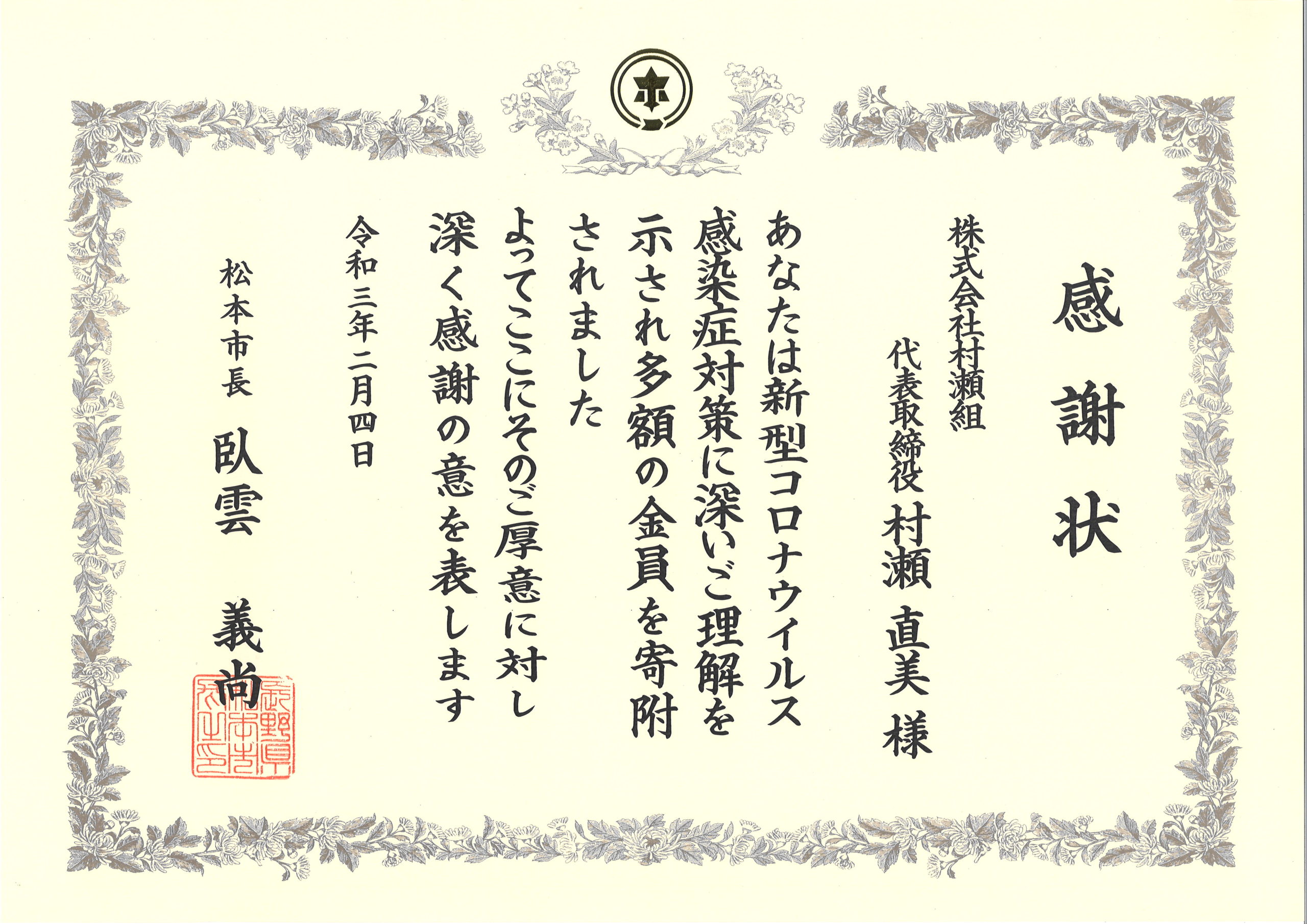 弊社では感染症対策・医療従事者支援の為、松本市へ寄付を行いました。